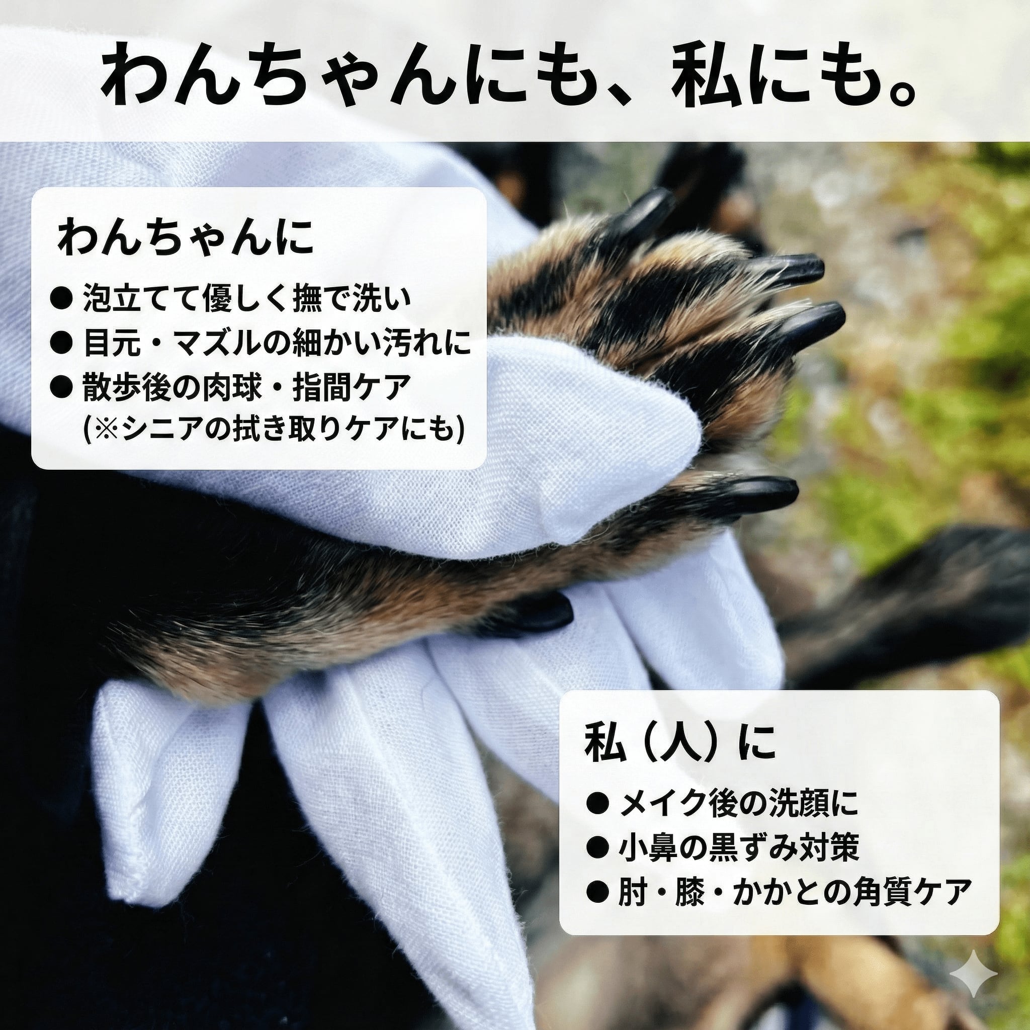 指先感覚で洗えるため、わんちゃんの目元、耳、肉球ケアや、飼い主様の洗顔、角質ケアにも最適。