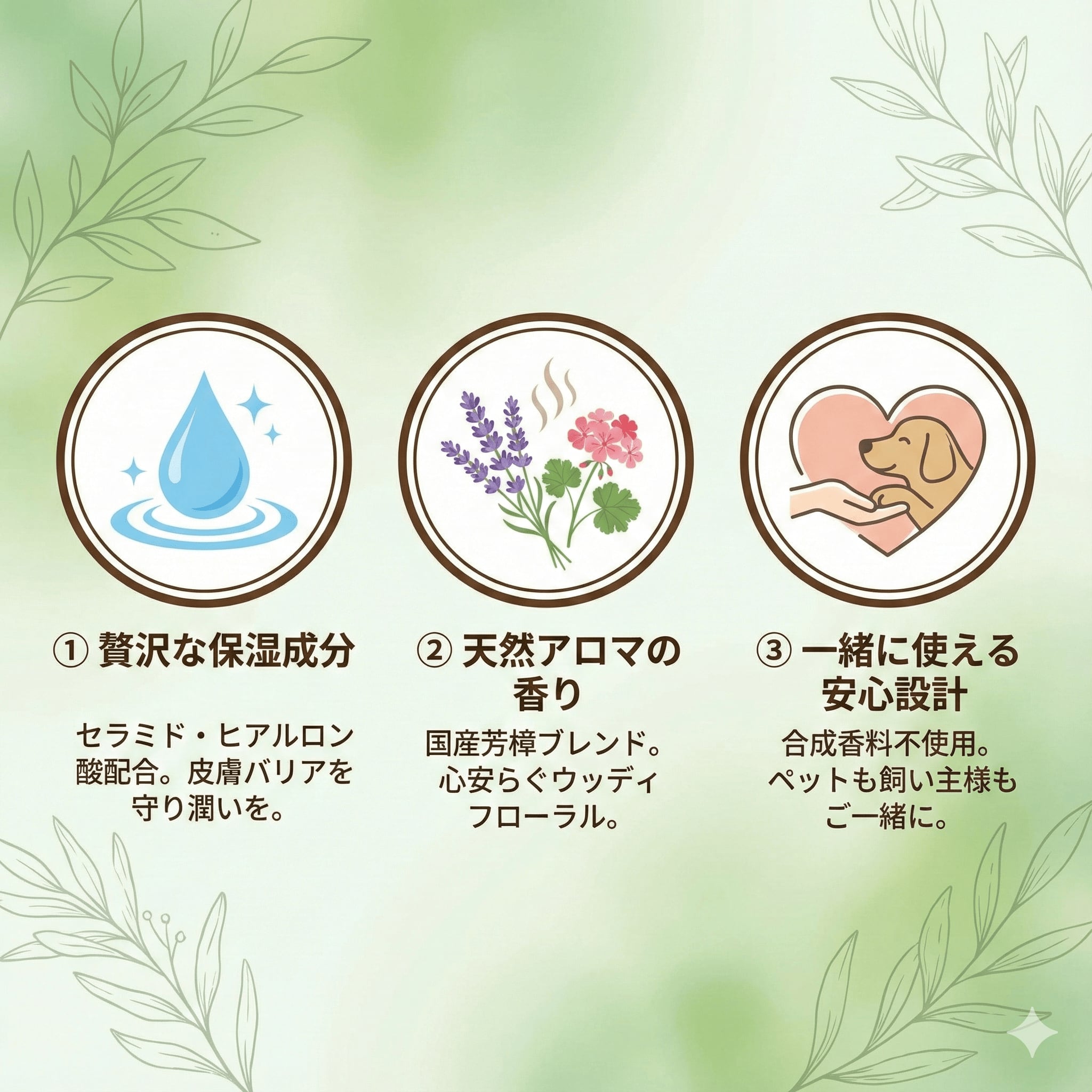芳樟(※)ラベンダーアングスティフォリア(※)ゼラニウムエジプト(※)、3つの精油のブレンドは長年の経験から生まれたアロマメソッド。ヒトとペットが楽しめるウッディフローラルの香り。